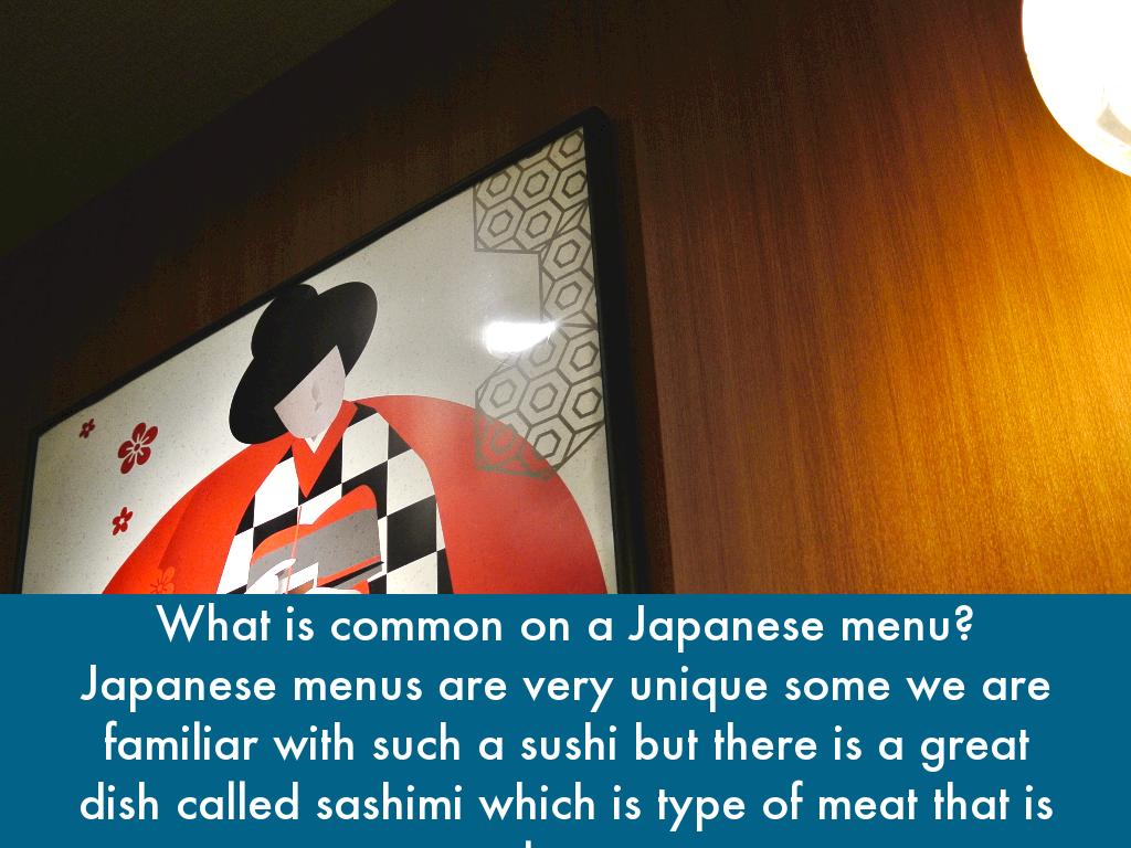 What is common on a Japanese menu? Japanese menus are very unique some we are familiar with such a sushi but there is a great dish called sashimi which is type of meat that is commonly eaten raw