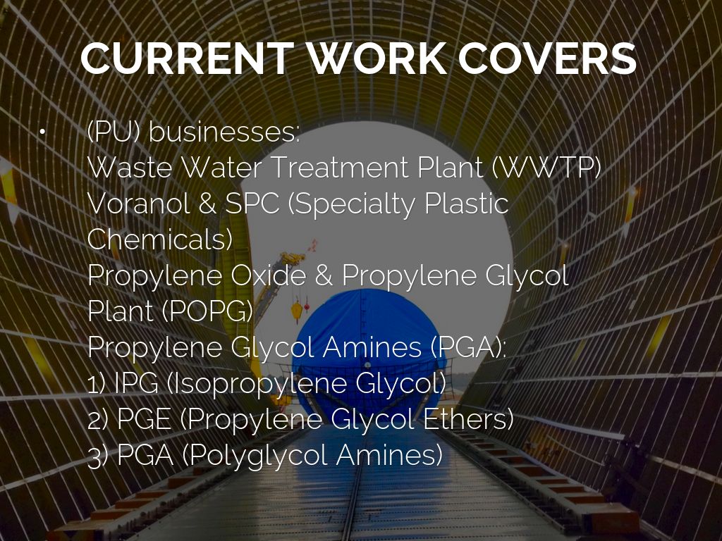 • (PU) businesses: Waste Water Treatment Plant (WWTP) Voranol & SPC (Specialty Plastic Chemicals) Propylene Oxide & Propylene Glycol Plant (POPG) Propylene Glycol Amines (PGA): 1) IPG (Isopropylene Glycol) 2) PGE (Propylene Glycol Ethers) 3) PGA (Polyglycol Amines) Glycidyl Methacrylate (GMA)