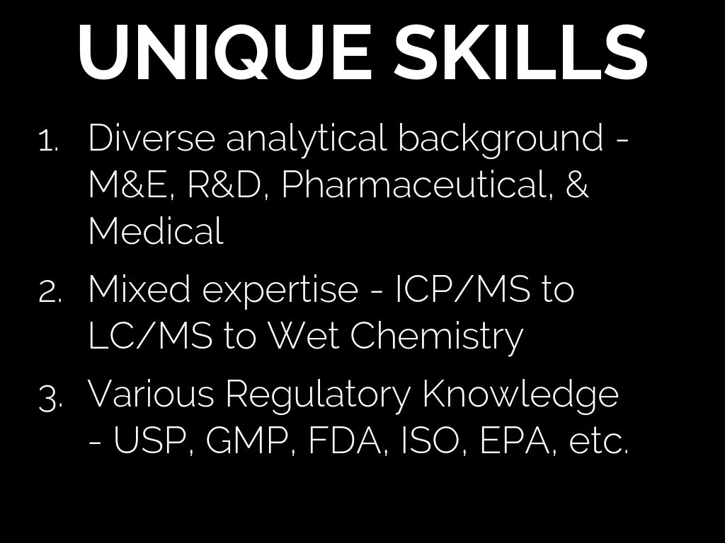 • Mixed expertise - ICP/MS to LC/MS to Wet Chemistry