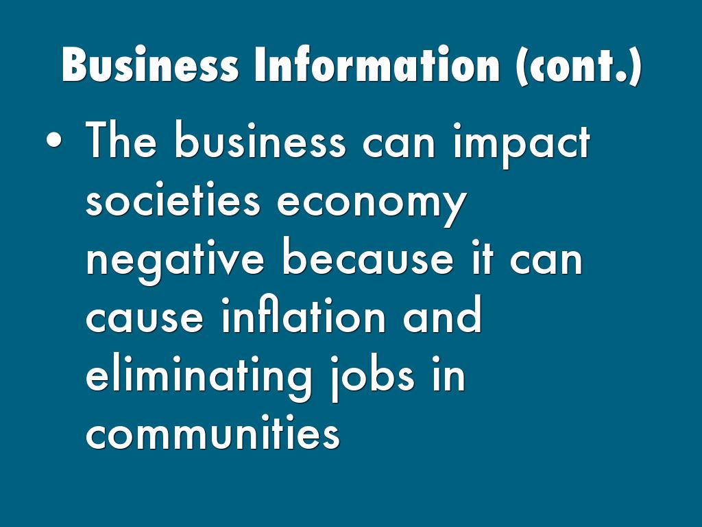 • The business can impact societies economy negative because it can cause inflation and eliminating jobs in communities