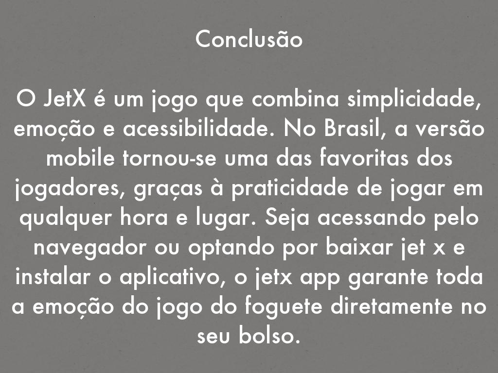 O JetX é um jogo que combina simplicidade, emoção e acessibilidade. No Brasil, a versão mobile tornou-se uma das favoritas dos jogadores, graças à praticidade de jogar em qualquer hora e lugar. Seja acessando pelo navegador ou optando por baixar jet x e instalar o aplicativo, o jetx app garante toda a emoção do jogo do foguete diretamente no seu bolso.