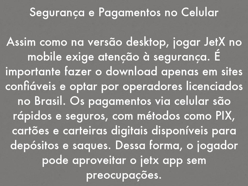 Assim como na versão desktop, jogar JetX no mobile exige atenção à segurança. É importante fazer o download apenas em sites confiáveis e optar por operadores licenciados no Brasil. Os pagamentos via celular são rápidos e seguros, com métodos como PIX, cartões e carteiras digitais disponíveis para depósitos e saques. Dessa forma, o jogador pode aproveitar o jetx app sem preocupações.