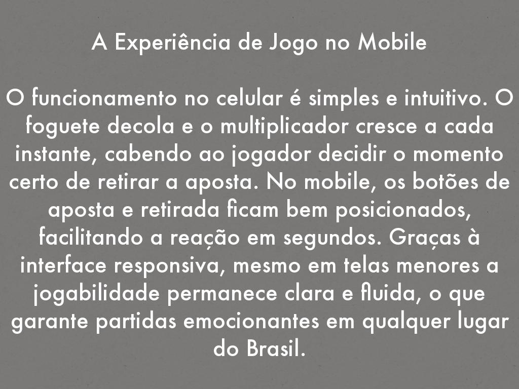 O funcionamento no celular é simples e intuitivo. O foguete decola e o multiplicador cresce a cada instante, cabendo ao jogador decidir o momento certo de retirar a aposta. No mobile, os botões de aposta e retirada ficam bem posicionados, facilitando a reação em segundos. Graças à interface responsiva, mesmo em telas menores a jogabilidade permanece clara e fluida, o que garante partidas emocionantes em qualquer lugar do Brasil.