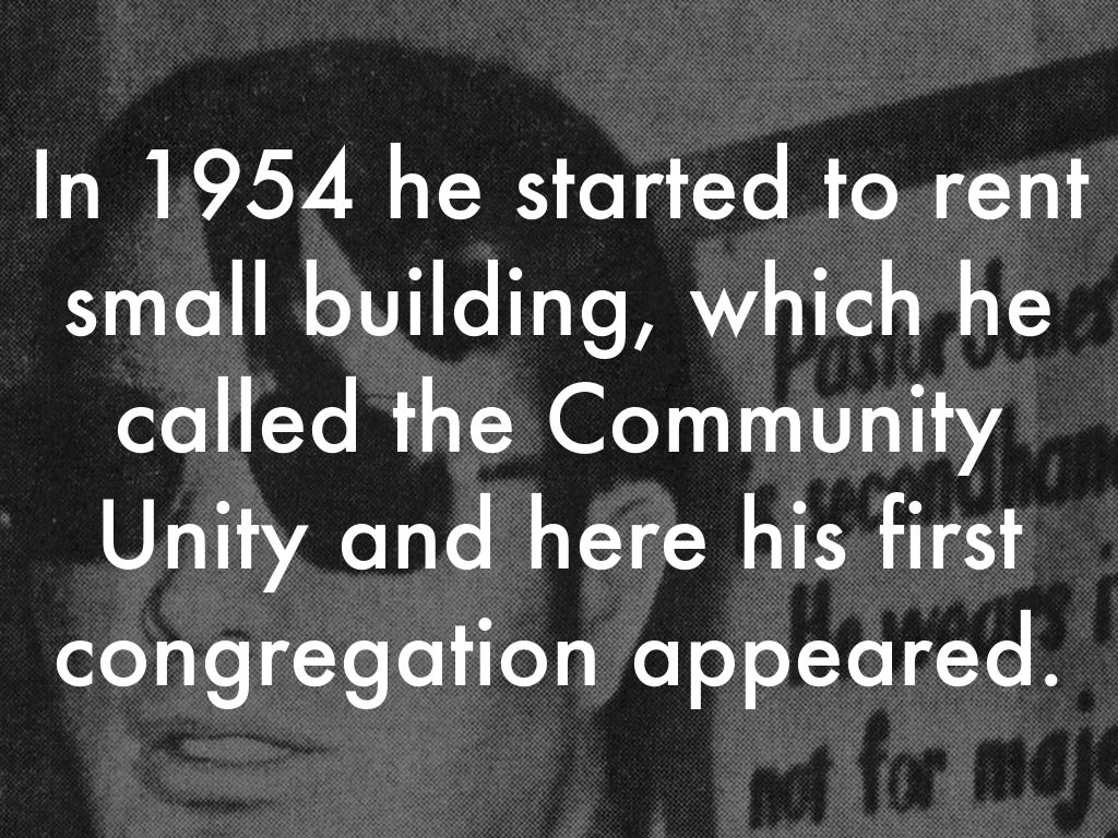 In 1954 he started to rent small building, which he called the Community Unity and here his first congregation appeared.