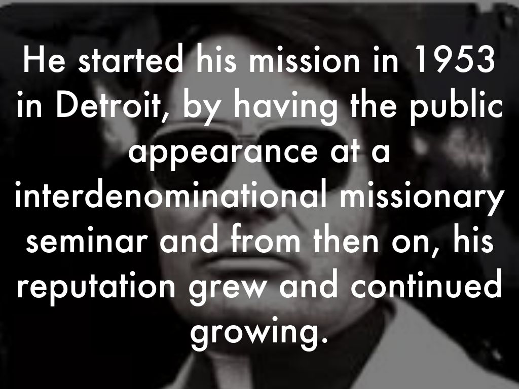He started his mission in 1953 in Detroit, by having the public appearance at a interdenominational missionary seminar and from then on, his reputation grew and continued growing.