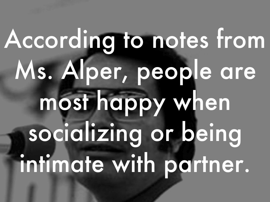 According to notes from Ms. Alper, people are most happy when socializing or being intimate with partner.