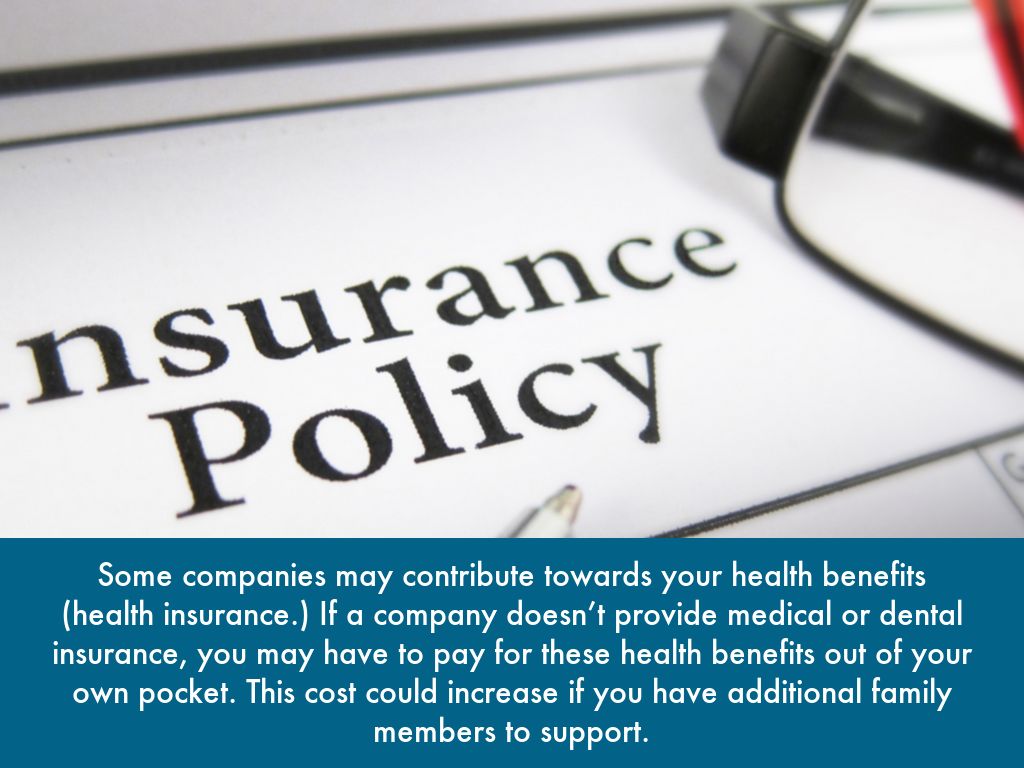 Some companies may contribute towards your health benefits (health insurance.) If a company doesn’t provide medical or dental insurance, you may have to pay for these health benefits out of your own pocket. This cost could increase if you have additional family members to support.