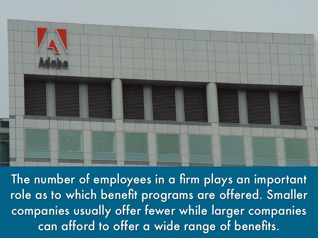 The number of employees in a firm plays an important role as to which benefit programs are offered. Smaller companies usually offer fewer while larger companies can afford to offer a wide range of benefits.