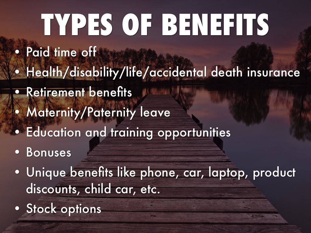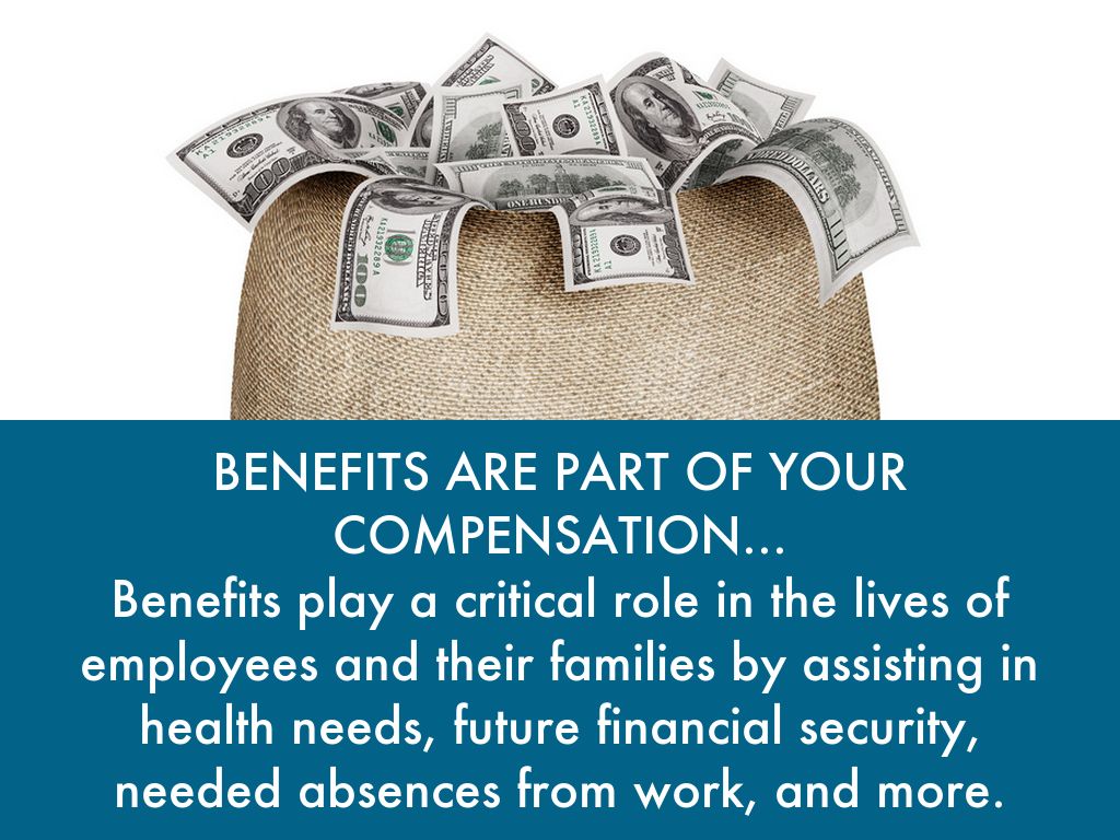 BENEFITS ARE PART OF YOUR COMPENSATION... Benefits play a critical role in the lives of employees and their families by assisting in health needs, future financial security, needed absences from work, and more.