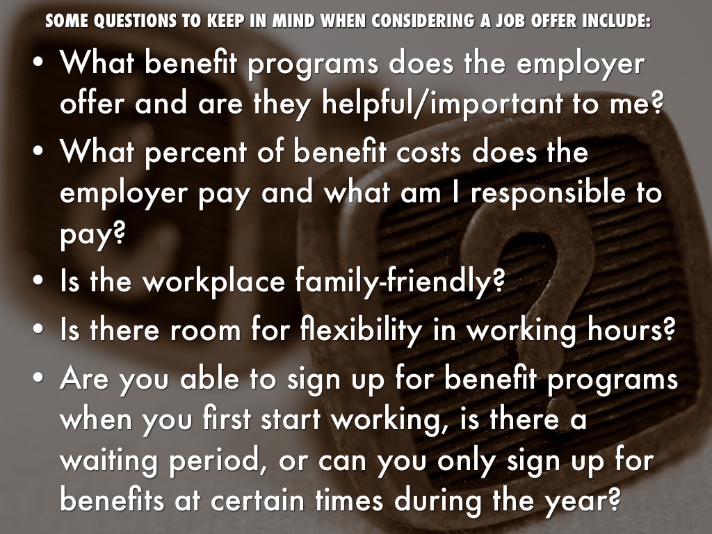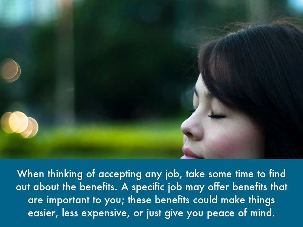 When thinking of accepting any job, take some time to find out about the benefits. A specific job may offer benefits that are important to you; these benefits could make things easier, less expensive, or just give you peace of mind.
