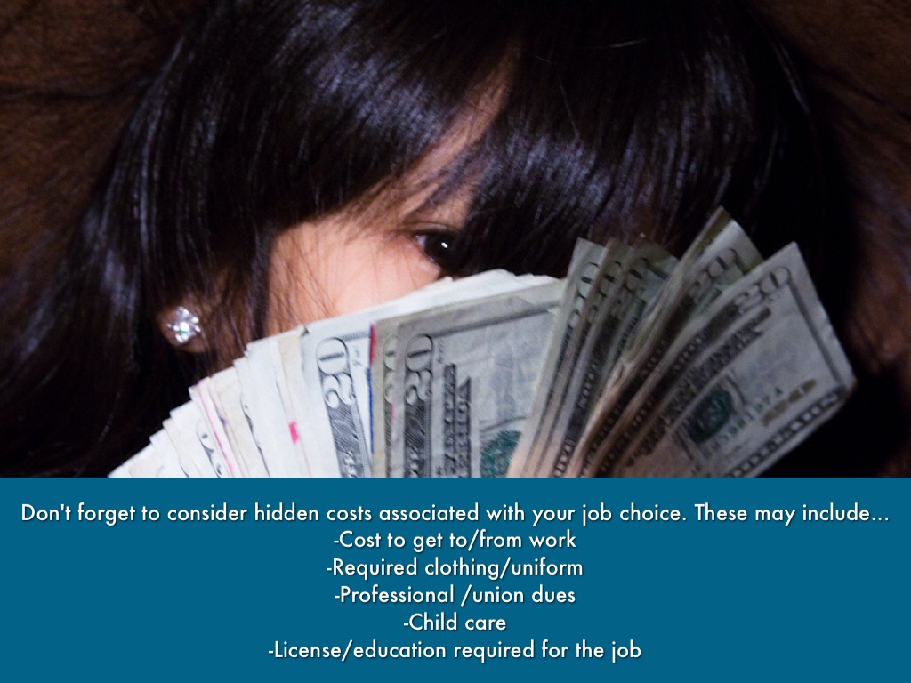 Don't forget to consider hidden costs associated with your job choice. These may include... -Cost to get to/from work -Required clothing/uniform -Professional /union dues -Child care -License/education required for the job