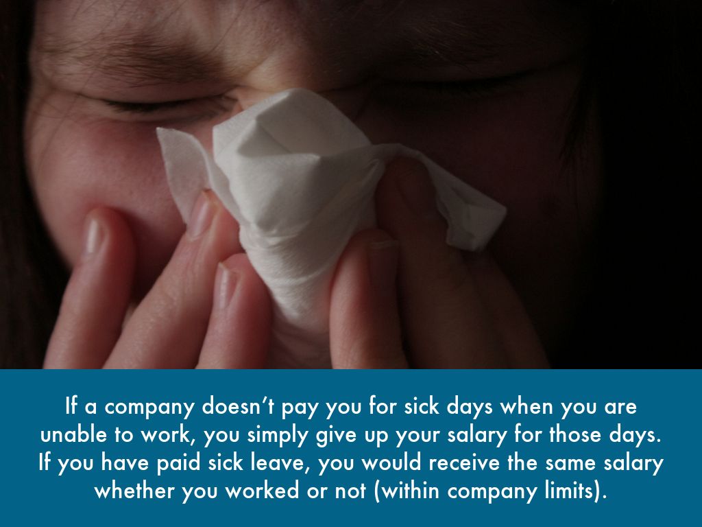 If a company doesn’t pay you for sick days when you are unable to work, you simply give up your salary for those days. If you have paid sick leave, you would receive the same salary whether you worked or not (within company limits).