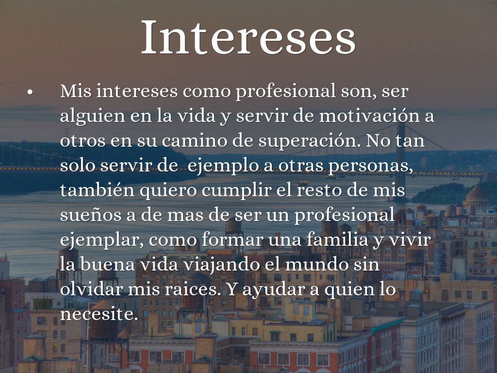 Mis intereses como profesional son, ser alguien en la vida y servir de motivación a otros en su camino de superación. No tan solo servir de ejemplo a otras personas, también quiero cumplir el resto de mis sueños a de mas de ser un profesional ejemplar, como formar una familia y vivir la buena vida viajando el mundo sin olvidar mis raices. Y ayudar a quien lo necesite.