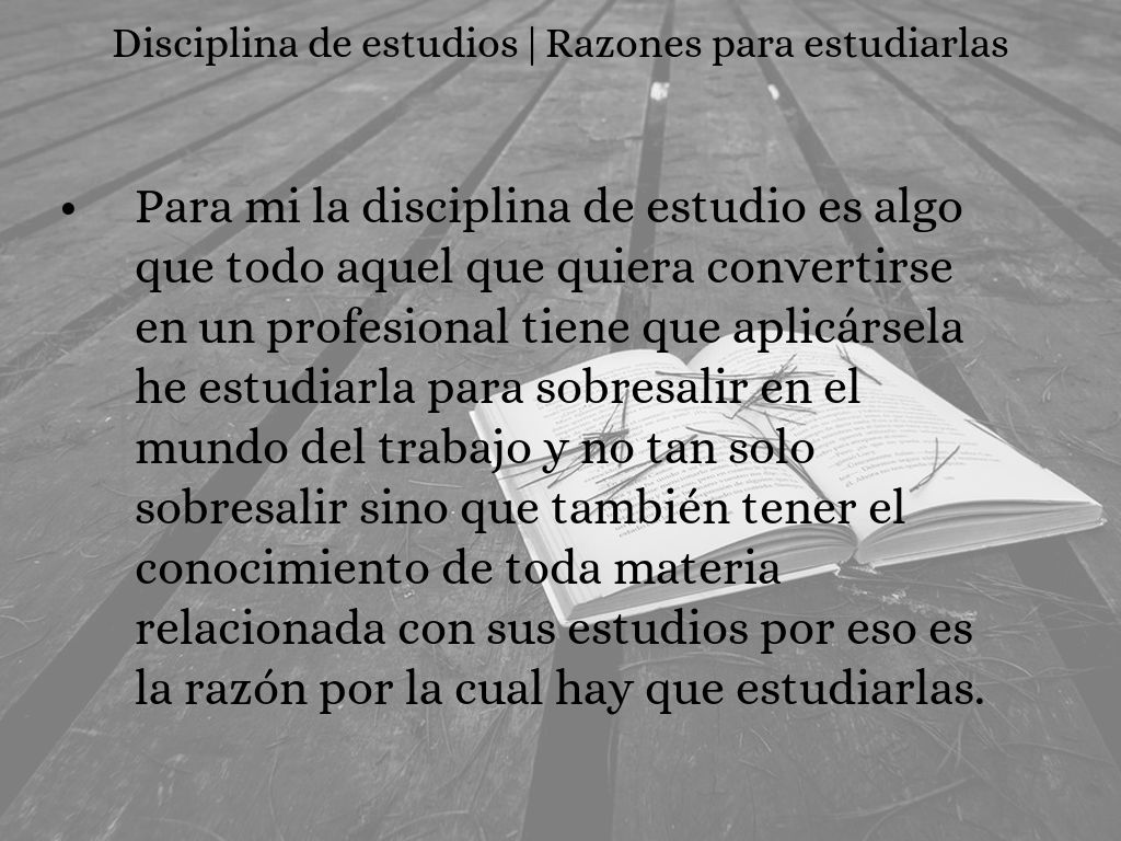 Para mi la disciplina de estudio es algo que todo aquel que quiera convertirse en un profesional tiene que aplicársela he estudiarla para sobresalir en el mundo del trabajo y no tan solo sobresalir sino que también tener el conocimiento de toda materia relacionada con sus estudios por eso es la razón por la cual hay que estudiarlas.