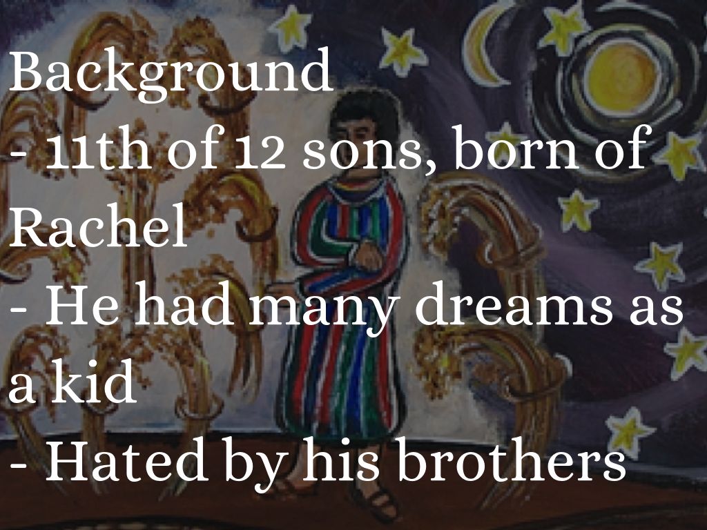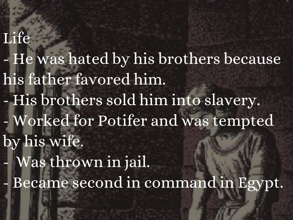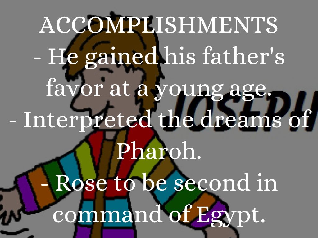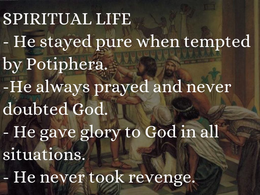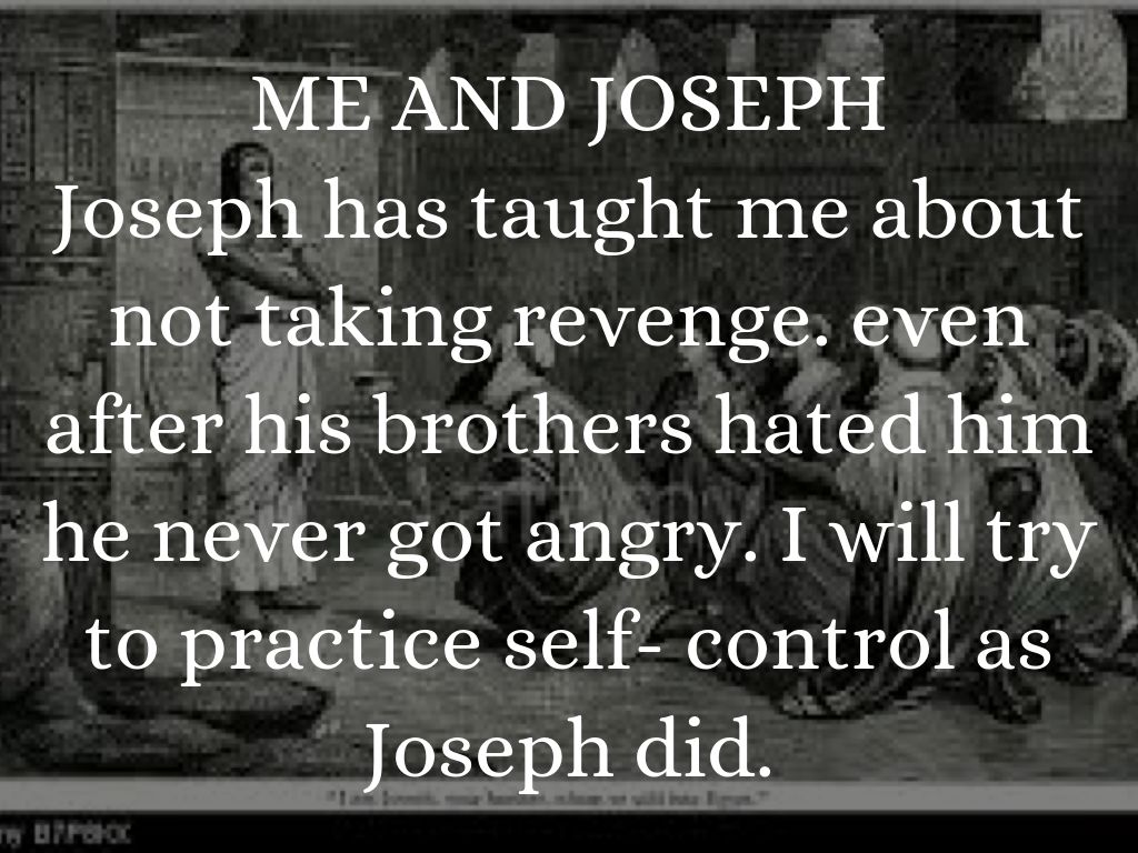 Joseph has taught me about not taking revenge. even after his brothers hated him he never got angry. I will try to practice self- control as Joseph did.
