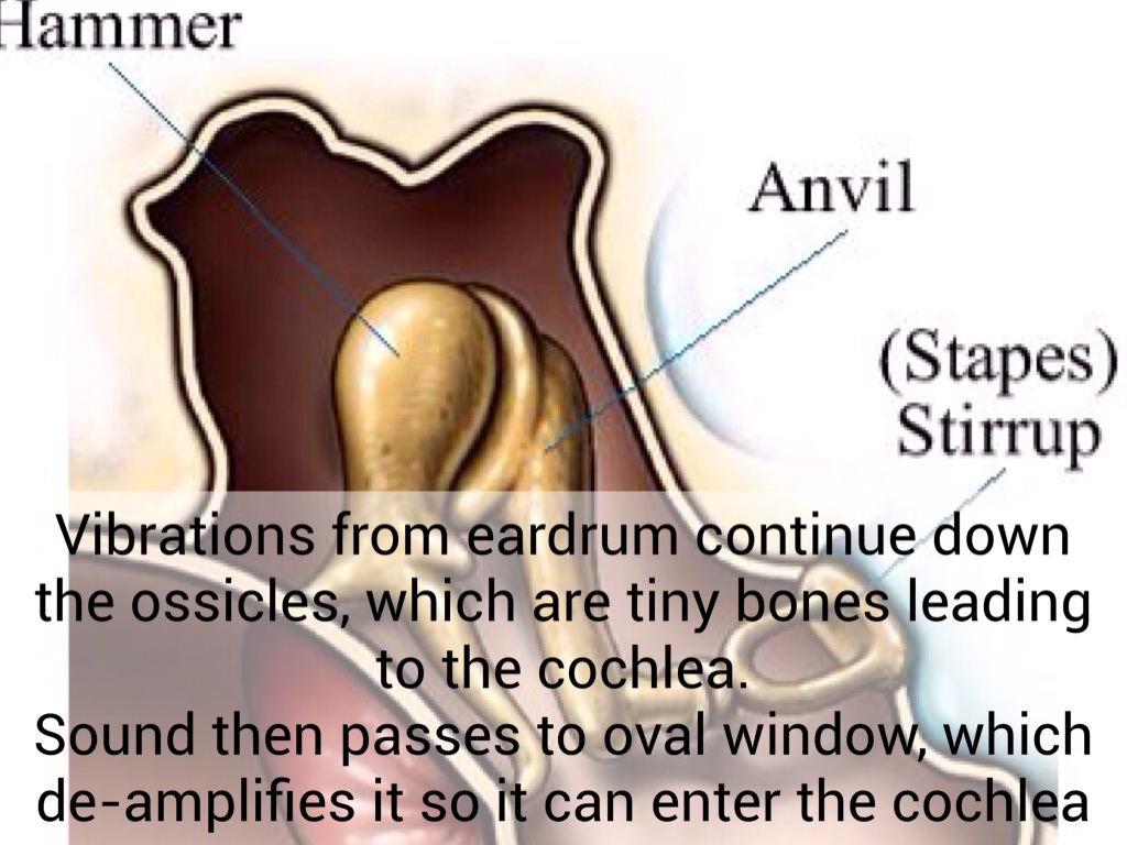 Sound then passes to oval window, which de-amplifies it so it can enter the cochlea