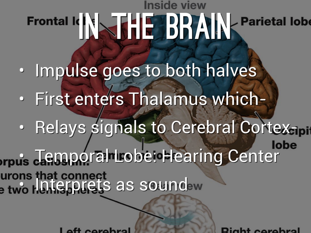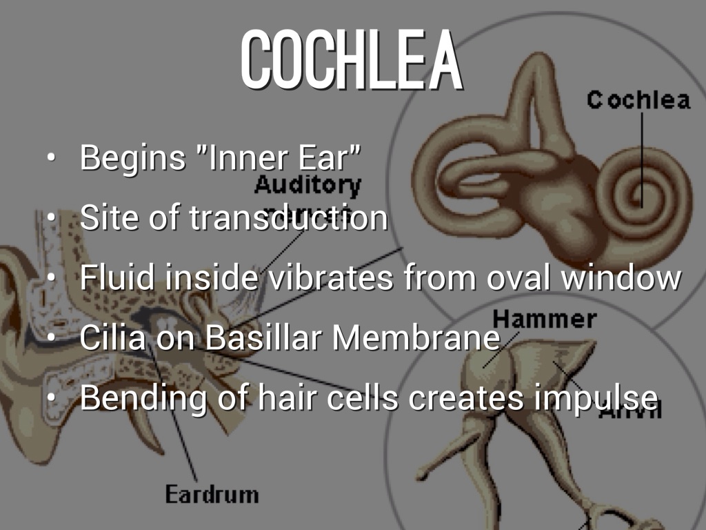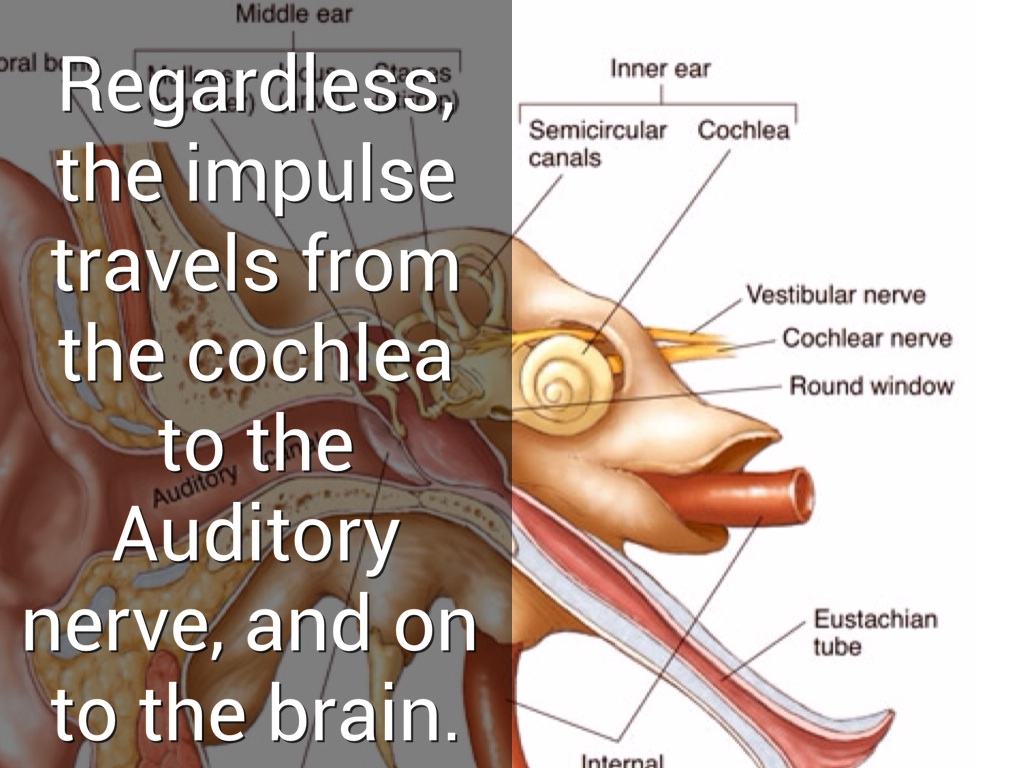 Regardless, the impulse travels from the cochlea to the Auditory nerve, and on to the brain.