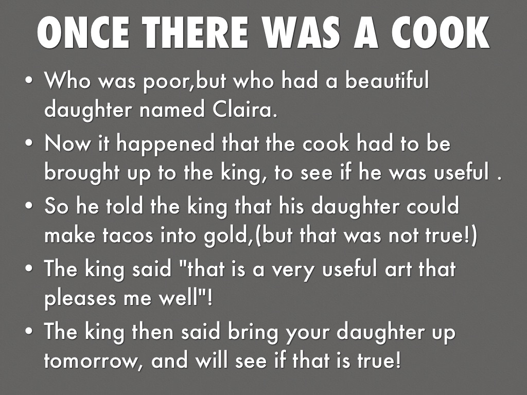 She replied "my father told the king that I could make tacos into gold , but I can't I tried."