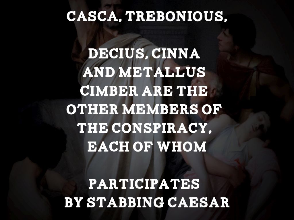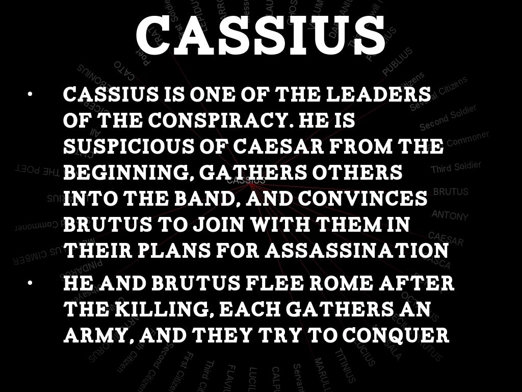 Cassius is one of the leaders of the conspiracy. He is suspicious of Caesar from the beginning, gathers others into the band, and convinces Brutus to join with them in their plans for assassination