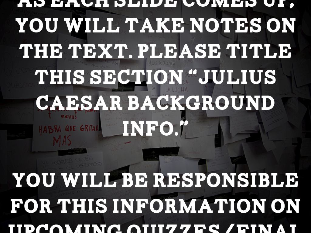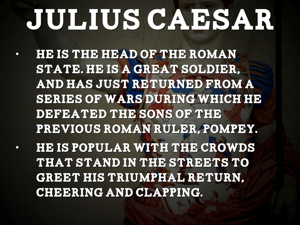 He is the head of the Roman state. He is a great soldier, and has just returned from a series of wars during which he defeated the sons of the previous Roman ruler, Pompey.