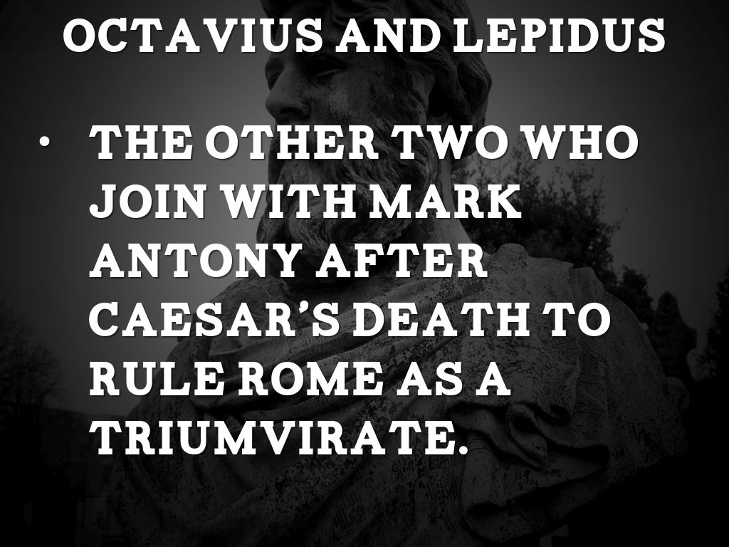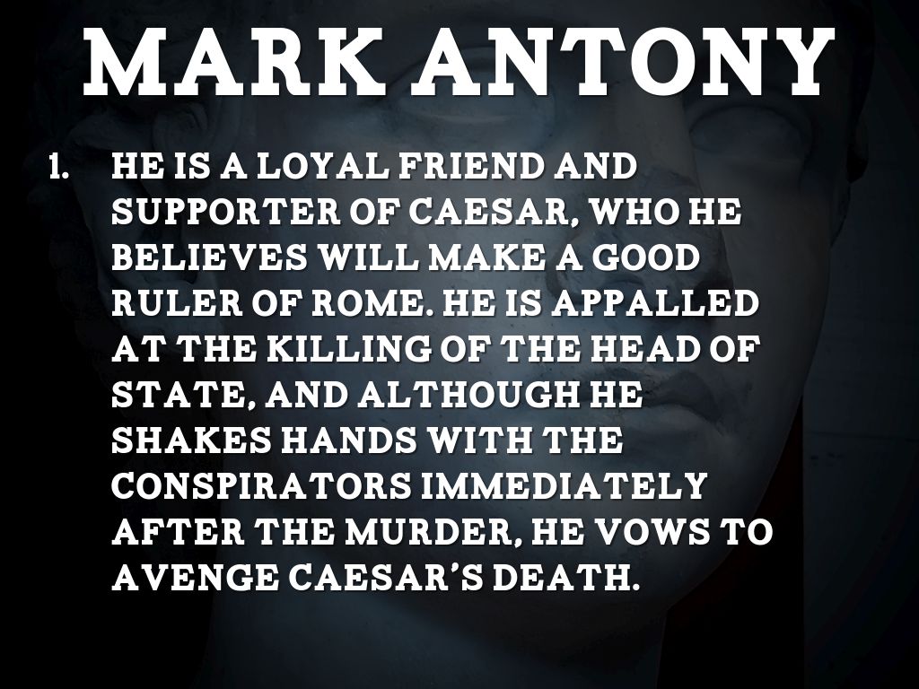 He is a loyal friend and supporter of Caesar, who he believes will make a good ruler of Rome. He is appalled at the killing of the head of state, and although he shakes hands with the conspirators immediately after the murder, he vows to avenge Caesar’s death.
