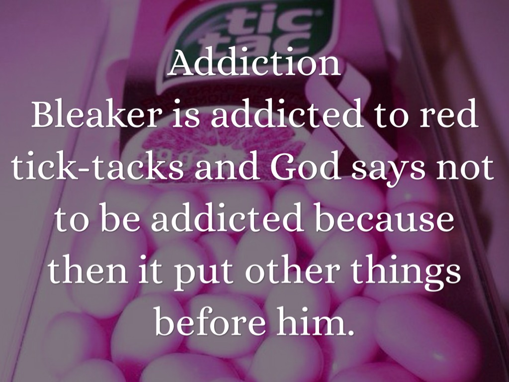 Bleaker is addicted to red tick-tacks and God says not to be addicted because then it put other things before him.