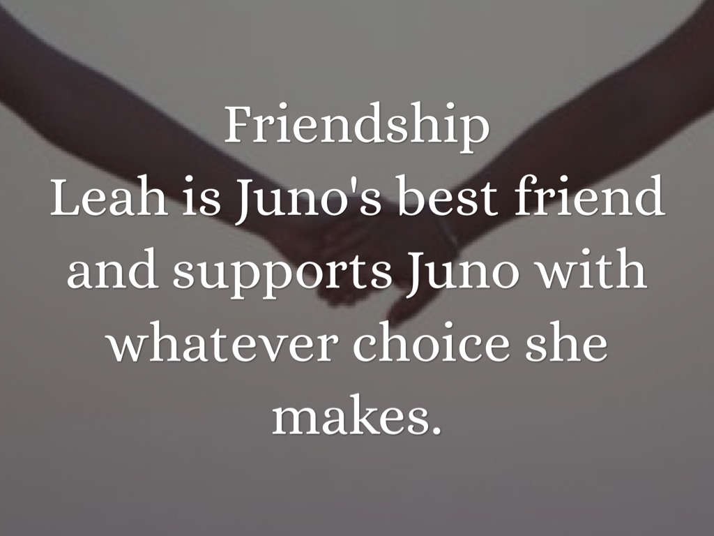 Leah is Juno's best friend and supports Juno with whatever choice she makes.