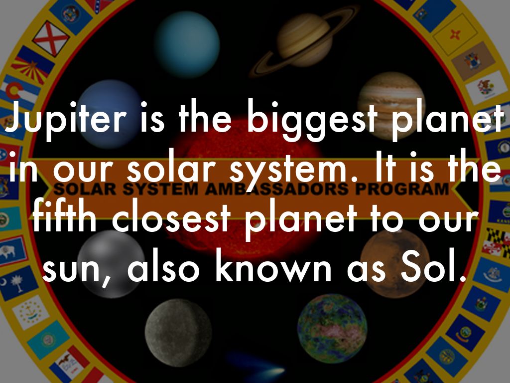 Jupiter is the biggest planet in our solar system. It is the fifth closest planet to our sun, also known as Sol.