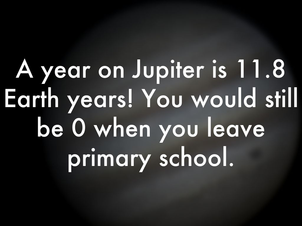 A year on Jupiter is 11.8 Earth years! You would still be 0 when you leave primary school.