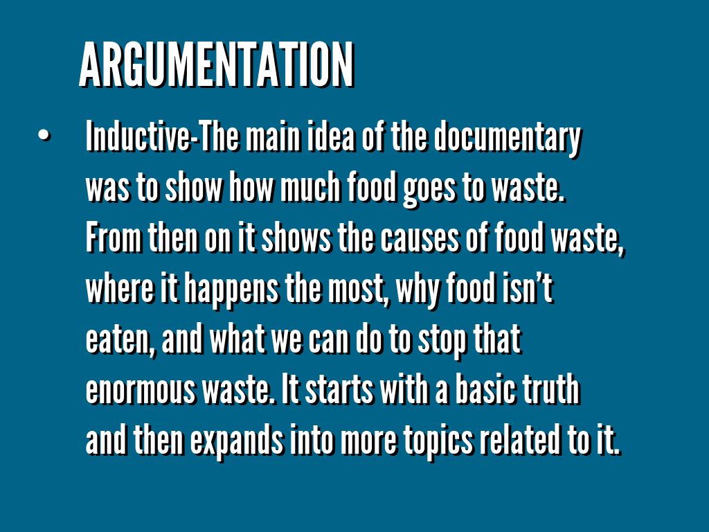 Inductive-The main idea of the documentary was to show how much food goes to waste. From then on it shows the causes of food waste, where it happens the most, why food isn't eaten, and what we can do to stop that enormous waste. It starts with a basic truth and then expands into more topics related to it.