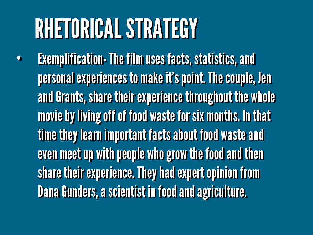 Exemplification- The film uses facts, statistics, and personal experiences to make it's point. The couple, Jen and Grants, share their experience throughout the whole movie by living off of food waste for six months. In that time they learn important facts about food waste and even meet up with people who grow the food and then share their experience. They had expert opinion from Dana Gunders, a scientist in food and agriculture.