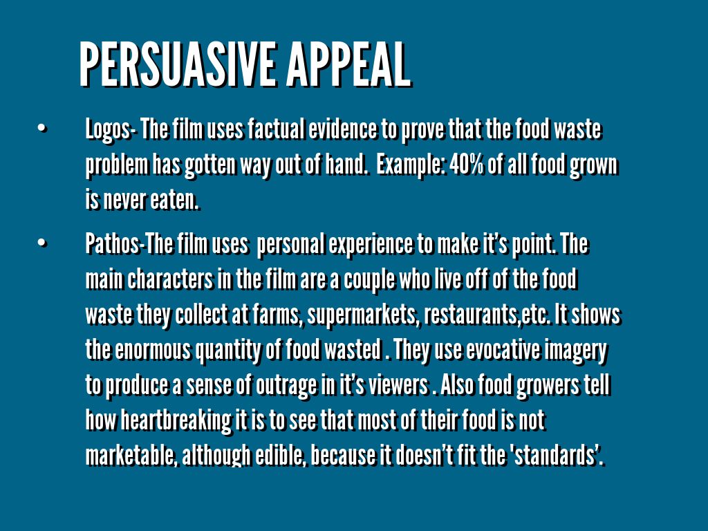 Logos- The film uses factual evidence to prove that the food waste problem has gotten way out of hand. Example: 40% of all food grown is never eaten.