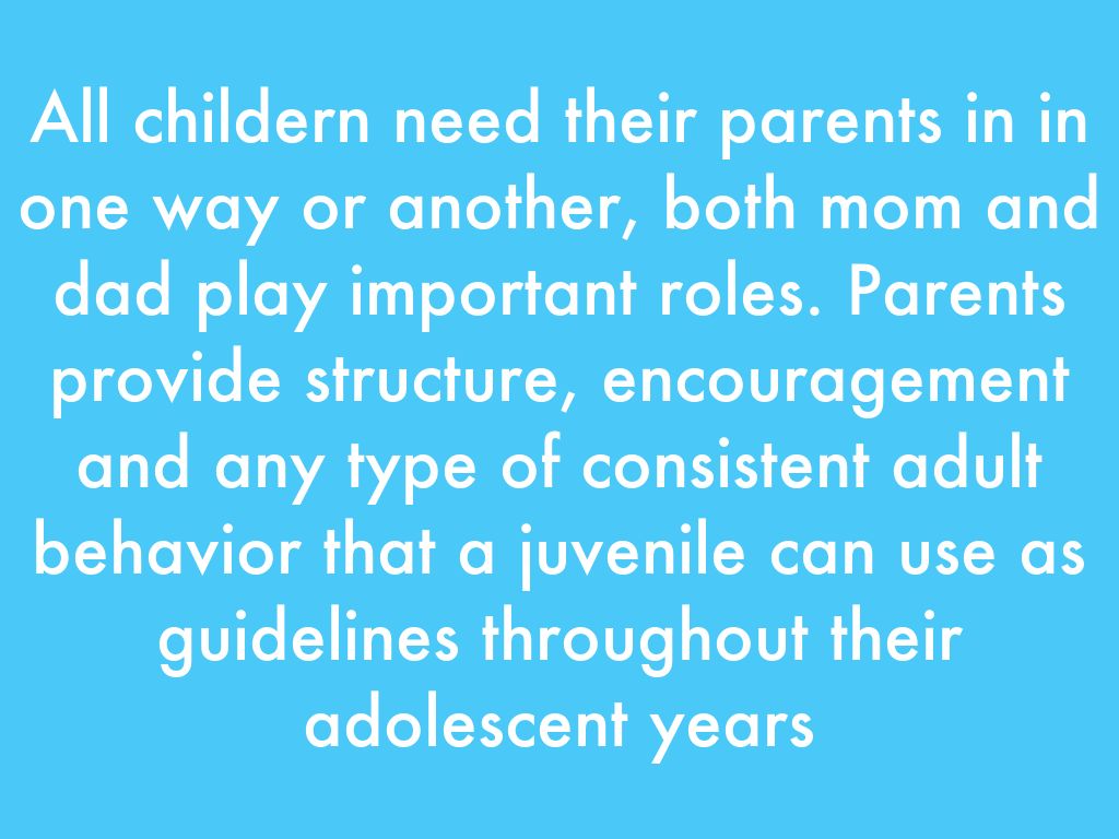 All children need their parents in in one way or another, both mom and dad play important roles. Parents provide structure, encouragement and any type of consistent adult behavior that a juvenile can use as guidelines throughout their adolescent years.