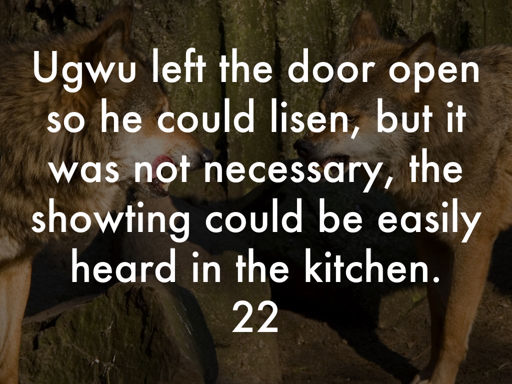 Ugwu left the door open so he could lisen, but it was not necessary, the showting could be easily heard in the kitchen.