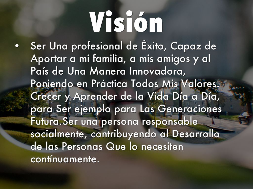 Ser Una profesional de Éxito, Capaz de Aportar a mi familia, a mis amigos y al País de Una Manera Innovadora, Poniendo en Práctica Todos Mis Valores. Crecer y Aprender de la Vida Día a Día, para Ser ejemplo para Las Generaciones Futura.Ser una persona responsable socialmente, contribuyendo al Desarrollo de las Personas Que lo necesiten contínuamente.