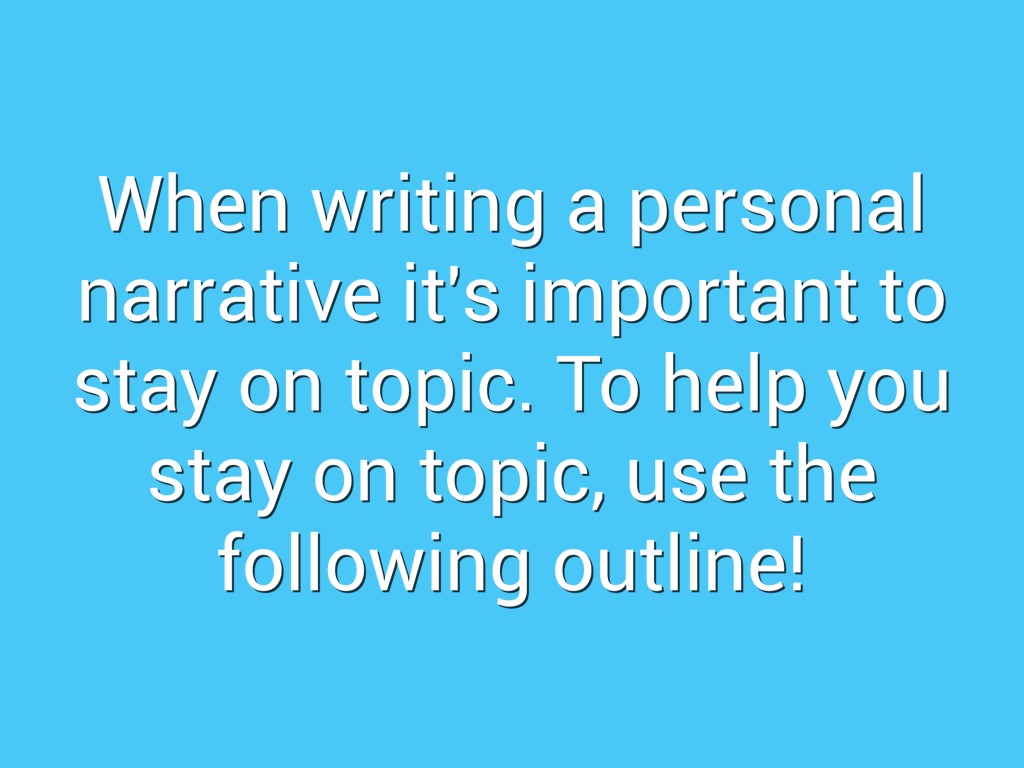When writing a personal narrative it's important to stay on topic. To help you stay on topic, use the following outline!