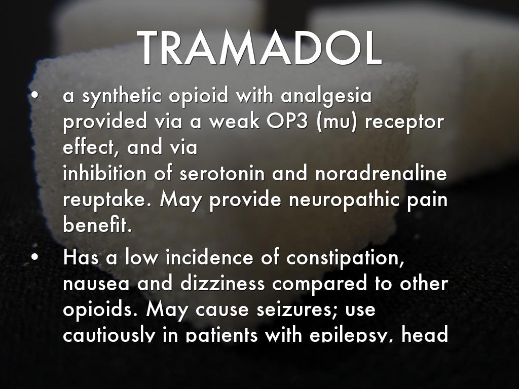 Has a low incidence of constipation, nausea and dizziness compared to other opioids. May cause seizures; use cautiously in patients with epilepsy, head
