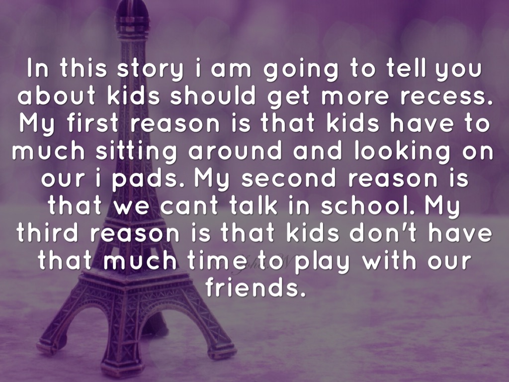 In this story i am going to tell you about kids should get more recess. My first reason is that kids have to much sitting around and looking on our i pads. My second reason is that we cant talk in school. My third reason is that kids don't have that much time to play with our friends.