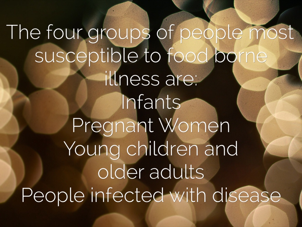 The four groups of people most susceptible to food borne illness are: Infants Pregnant Women Young children and older adults People infected with disease