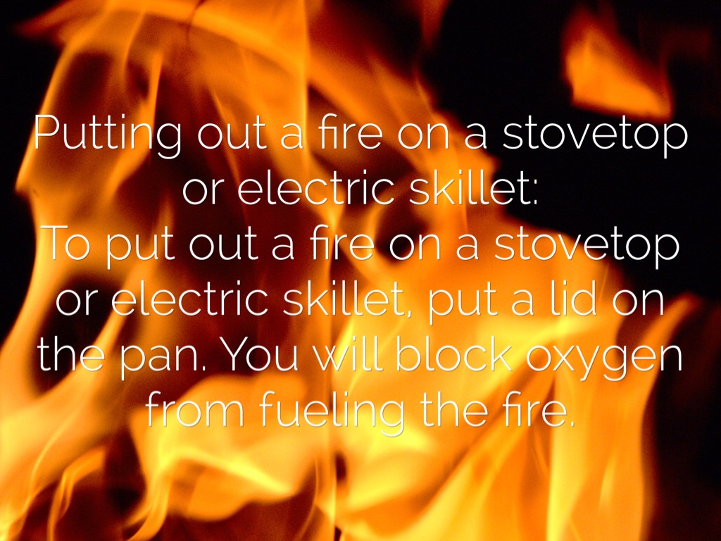 Putting out a fire on a stovetop or electric skillet: To put out a fire on a stovetop or electric skillet, put a lid on the pan. You will block oxygen from fueling the fire.
