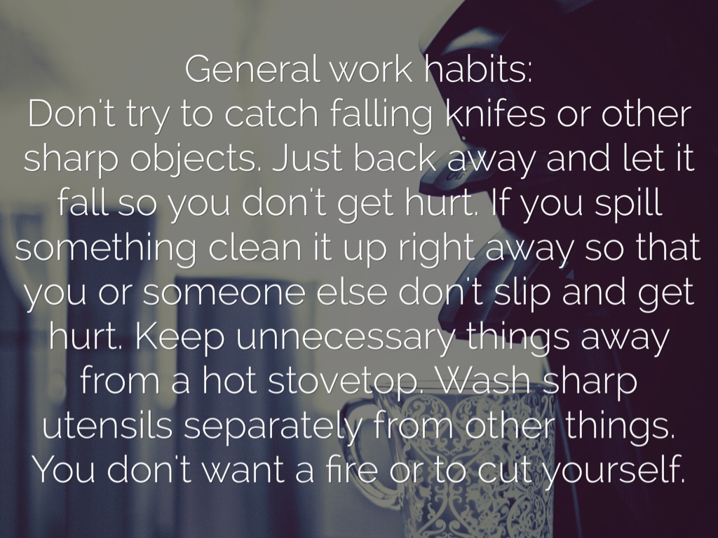 General work habits: Don't try to catch falling knifes or other sharp objects. Just back away and let it fall so you don't get hurt. If you spill something clean it up right away so that you or someone else don't slip and get hurt. Keep unnecessary things away from a hot stovetop. Wash sharp utensils separately from other things. You don't want a fire or to cut yourself.