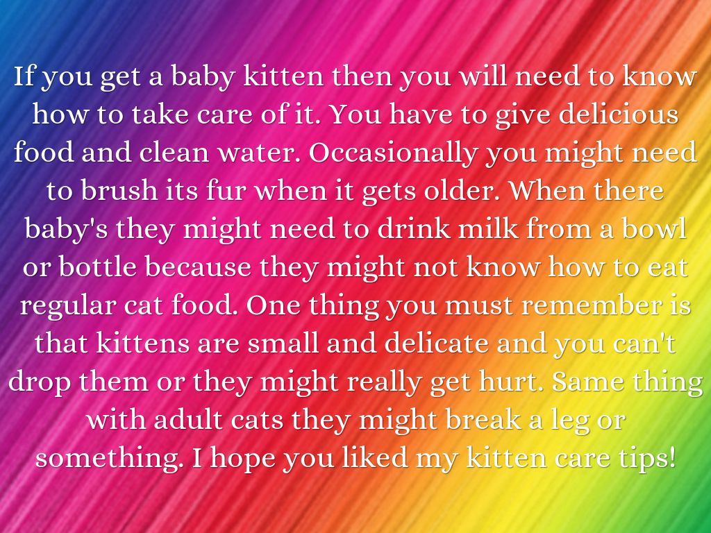 If you get a baby kitten then you will need to know how to take care of it. You have to give delicious food and clean water. Occasionally you might need to brush its fur when it gets older. When there baby's they might need to drink milk from a bowl or bottle because they might not know how to eat regular cat food. One thing you must remember is that kittens are small and delicate and you can't drop them or they might really get hurt. Same thing with adult cats they might break a leg or something. I hope you liked my kitten care tips!