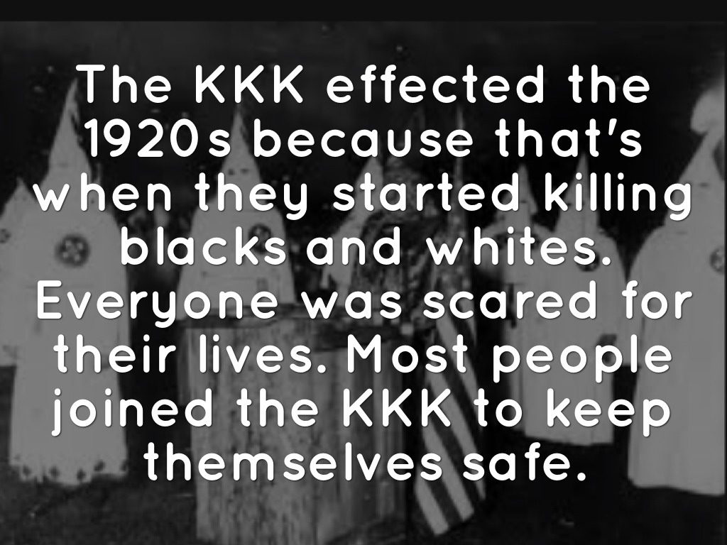 The KKK effected the 1920s because that's when they started killing blacks and whites. Everyone was scared for their lives. Most people joined the KKK to keep themselves safe.