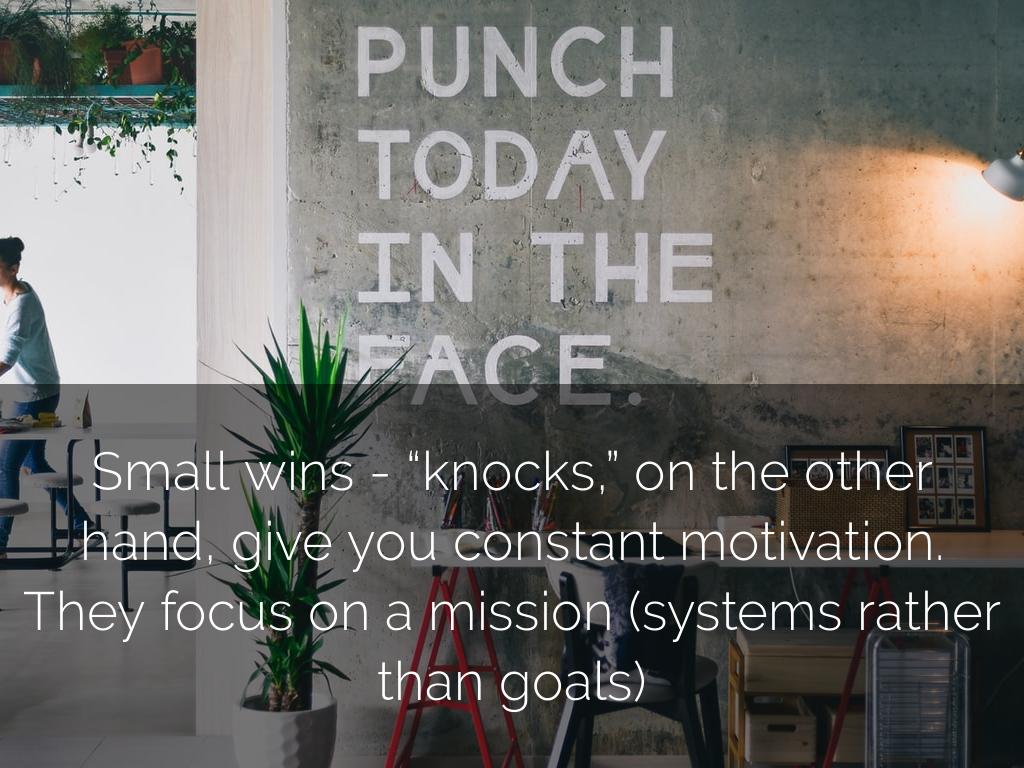 Small wins - “knocks,” on the other hand, give you constant motivation. They focus on a mission (systems rather than goals)