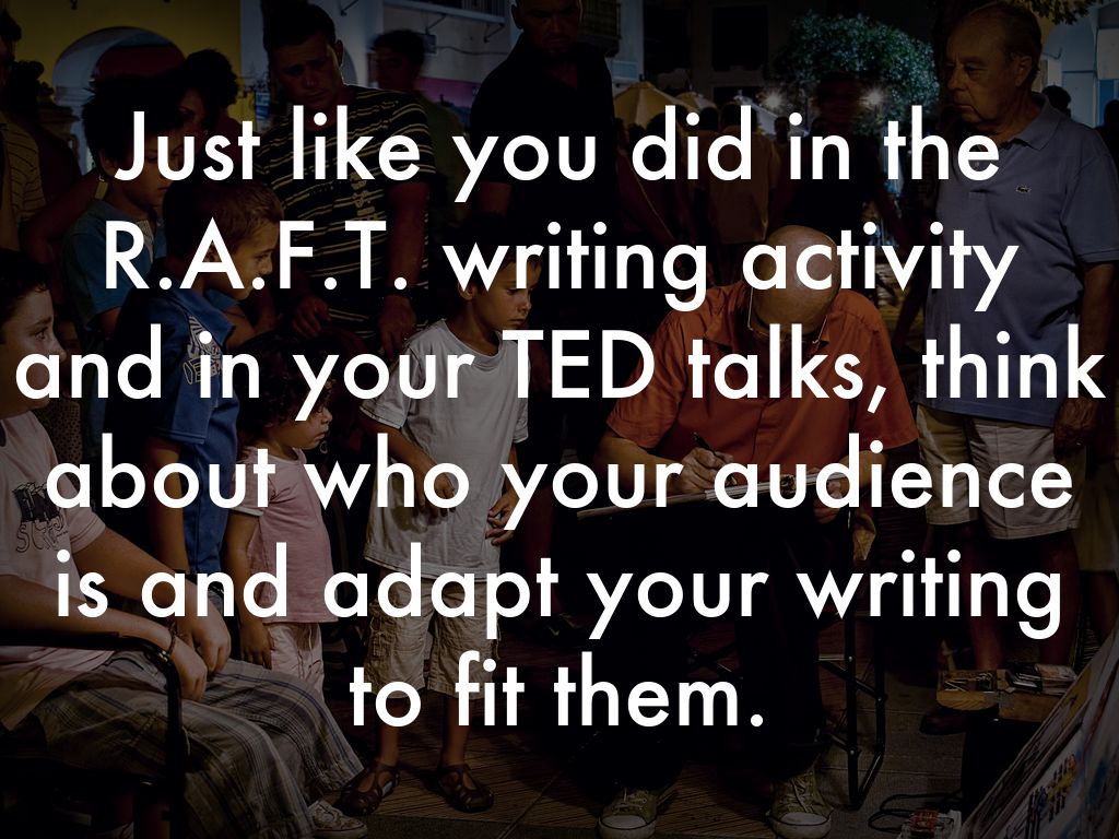 Just like you did in the R.A.F.T. writing activity and in your TED talks, think about who your audience is and adapt your writing to fit them.