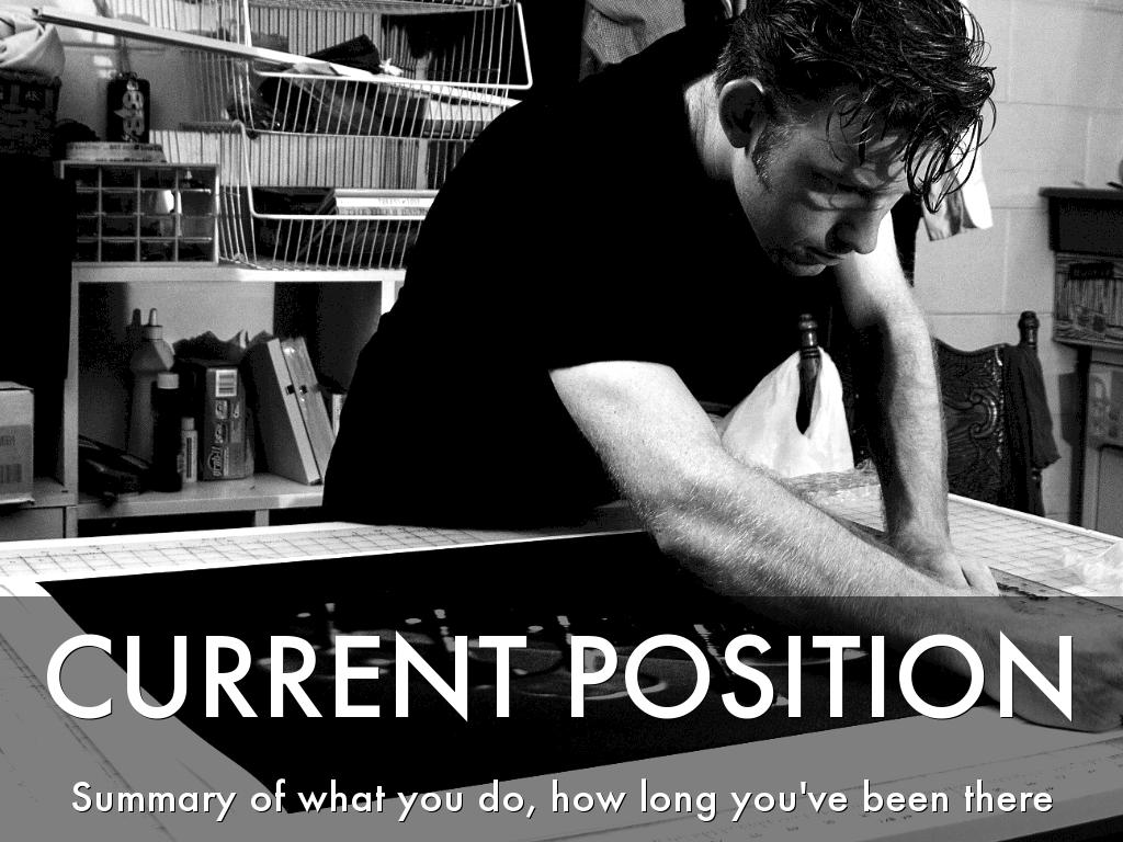You can change the order of these slides, or add more that follow a similar format, to suit your need or mood, but it might be helpful to showcase your current role, summarizing your primary responsibilities and how long you've been part of the team.