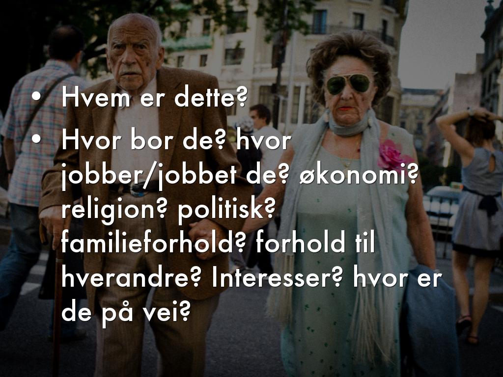 Hvor bor de? hvor jobber/jobbet de? økonomi? religion? politisk? familieforhold? forhold til hverandre? Interesser? hvor er de på vei?
