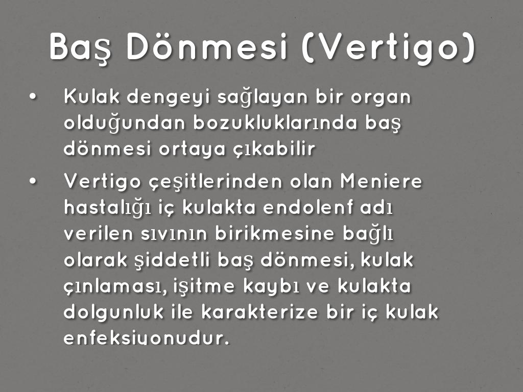 • Vertigo çeşitlerinden olan Meniere hastalığı iç kulakta endolenf adı verilen sıvının birikmesine bağlı olarak şiddetli baş dönmesi, kulak çınlaması, işitme kaybı ve kulakta dolgunluk ile karakterize bir iç kulak enfeksiyonudur.