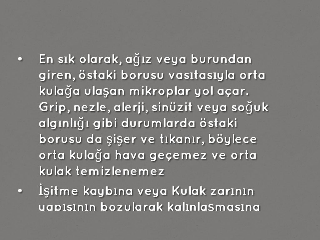 • En sık olarak, ağız veya burundan giren, östaki borusu vasıtasıyla orta kulağa ulaşan mikroplar yol açar. Grip, nezle, alerji, sinüzit veya soğuk algınlığı gibi durumlarda östaki borusu da şişer ve tıkanır, böylece orta kulağa hava geçemez ve orta kulak temizlenemez