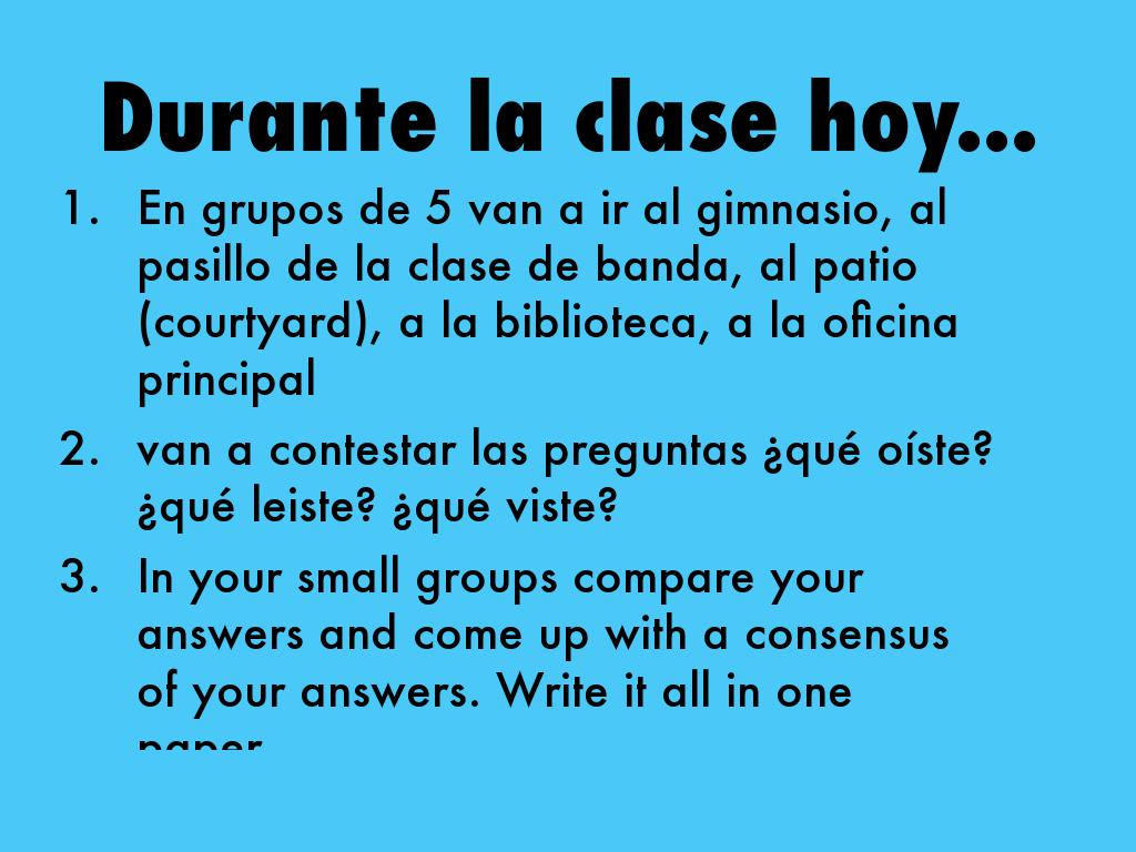 En grupos de 5 van a ir al gimnasio, al pasillo de la clase de banda, al patio (courtyard), a la biblioteca, a la oficina principal